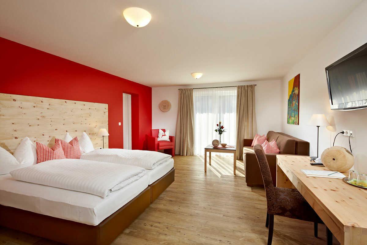 | Panorama-Zirbensuite ca. 45 m² Zirben-Suiten mit großzügigem Schlafzimmer mit Sitzecke und teilweise Mansardenschlafbereich für Kinder, Dusche/WC getrennt, Fön, Kabel-TV, Zimmersafe, Balkon; Allergikerfreundlich! | ab € 121,00 |